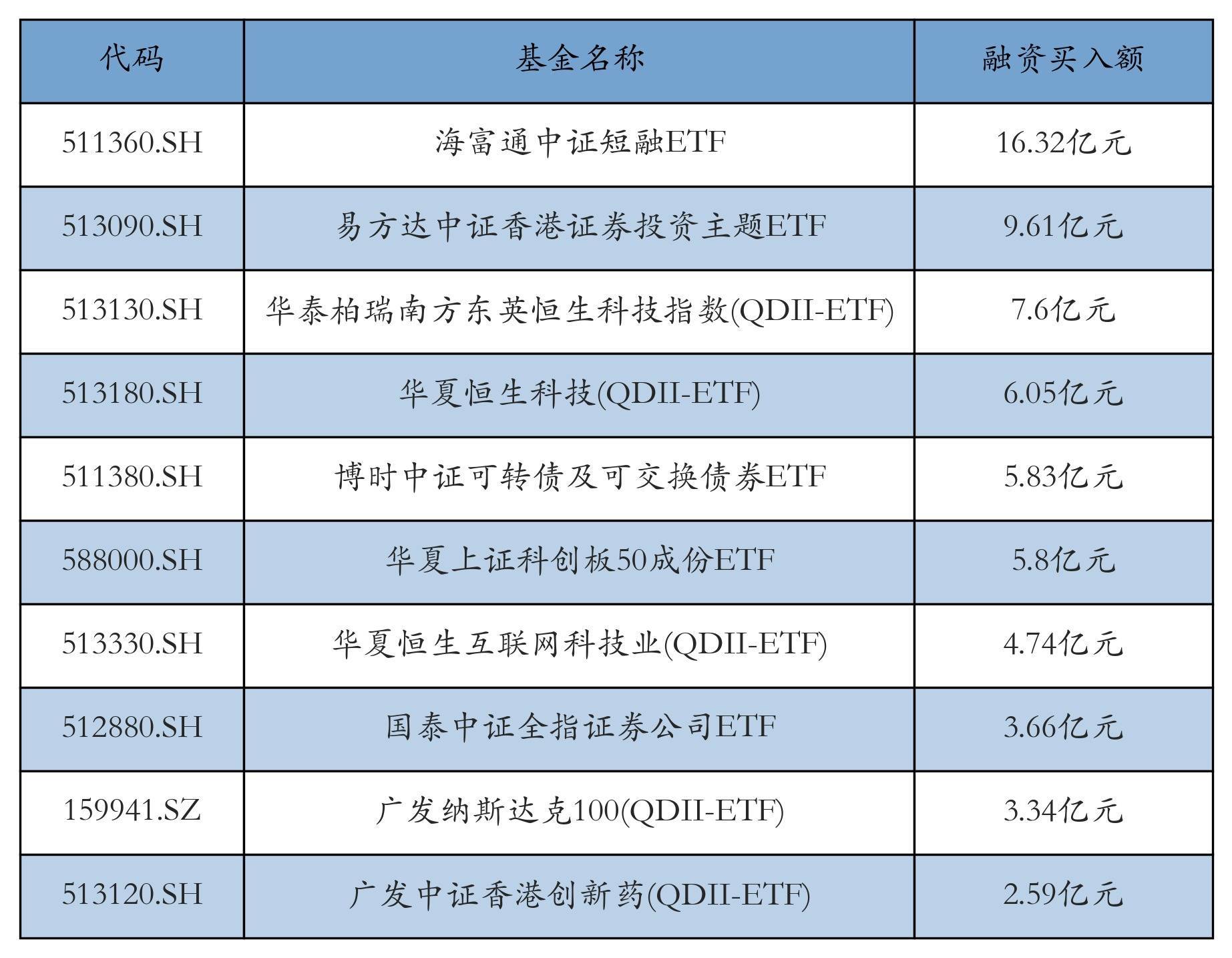 12月10日ETF融资买入额前三位分别为:海富通中证短融ETF(16.32亿元)、易方达中证香港证券投资主题ETF(9.61亿元)和华泰柏瑞南方东英恒生科技指数(QDII-ETF)(7.6亿元)易云达配资,前10具体见下表: