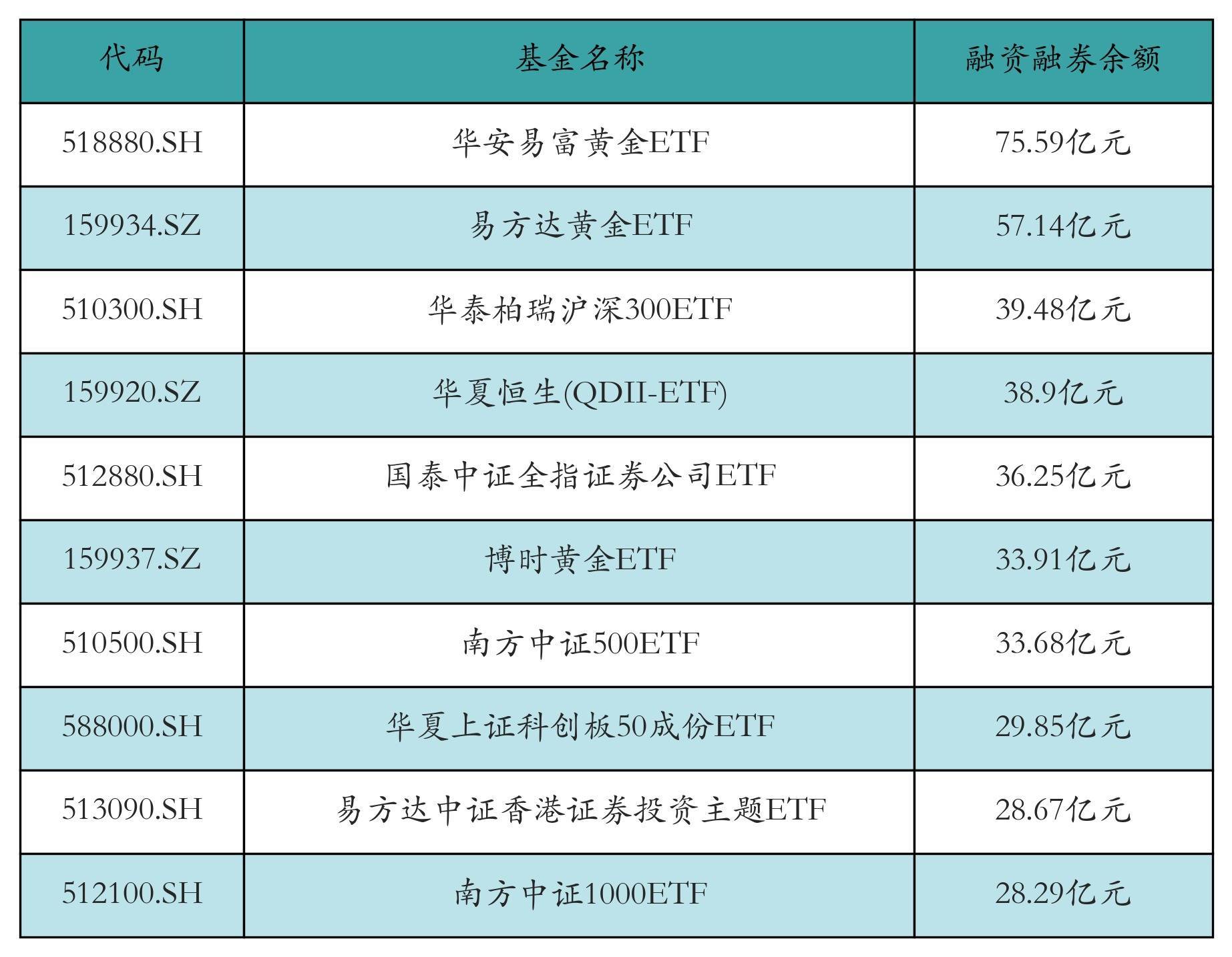 12月10日ETF两融余额前三位分别为:华安易富黄金ETF(75.59亿元)、易方达黄金ETF(57.14亿元)和华泰柏瑞沪深300ETF(39.48亿元),前10具体见下表: