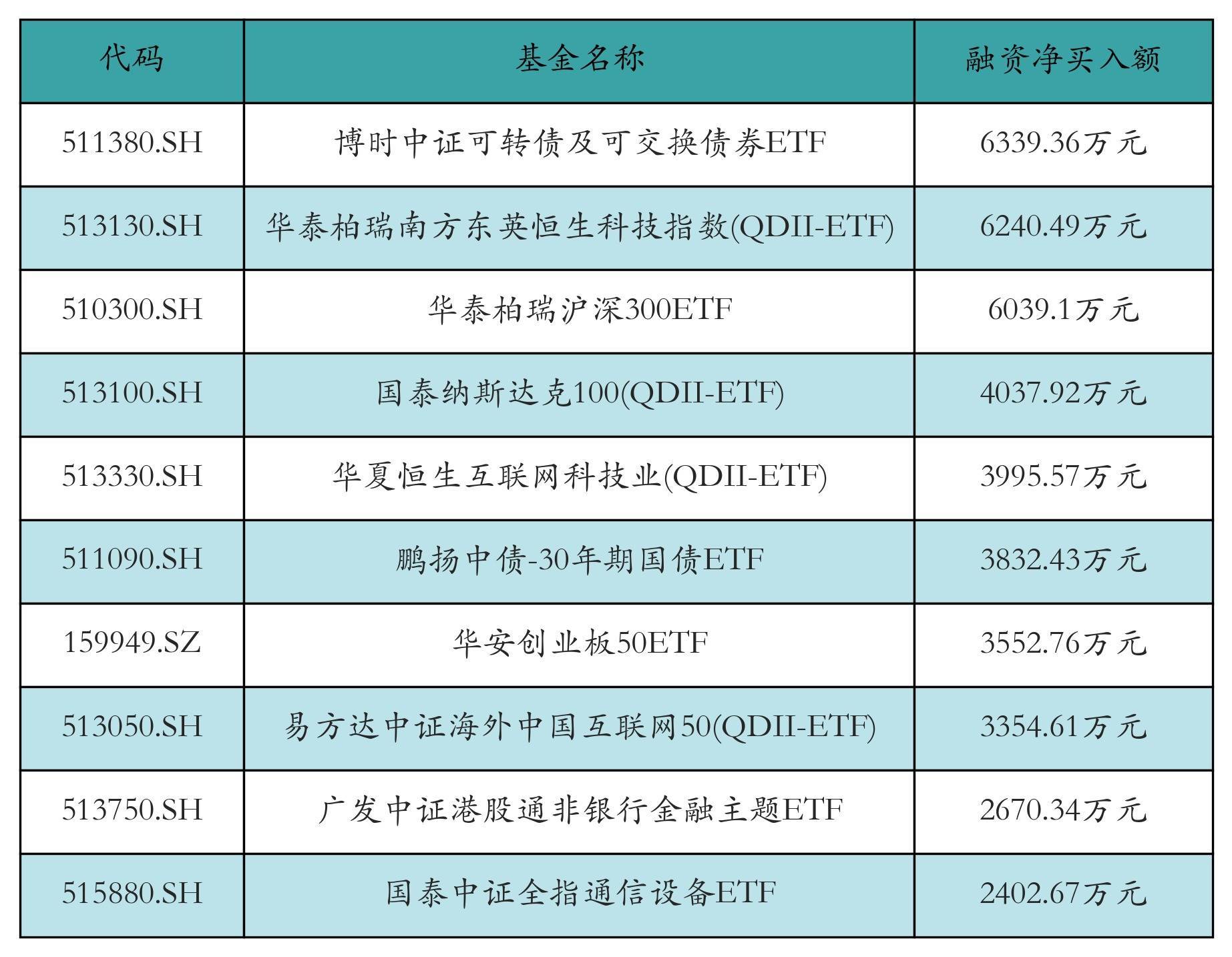 12月10日ETF融资净买入额前三位分别为:博时中证可转债及可交换债券ETF(6339.36万元)、华泰柏瑞南方东英恒生科技指数(QDII-ETF)(6240.49万元)和华泰柏瑞沪深300ETF(6039.1万元),前10具体见下表: